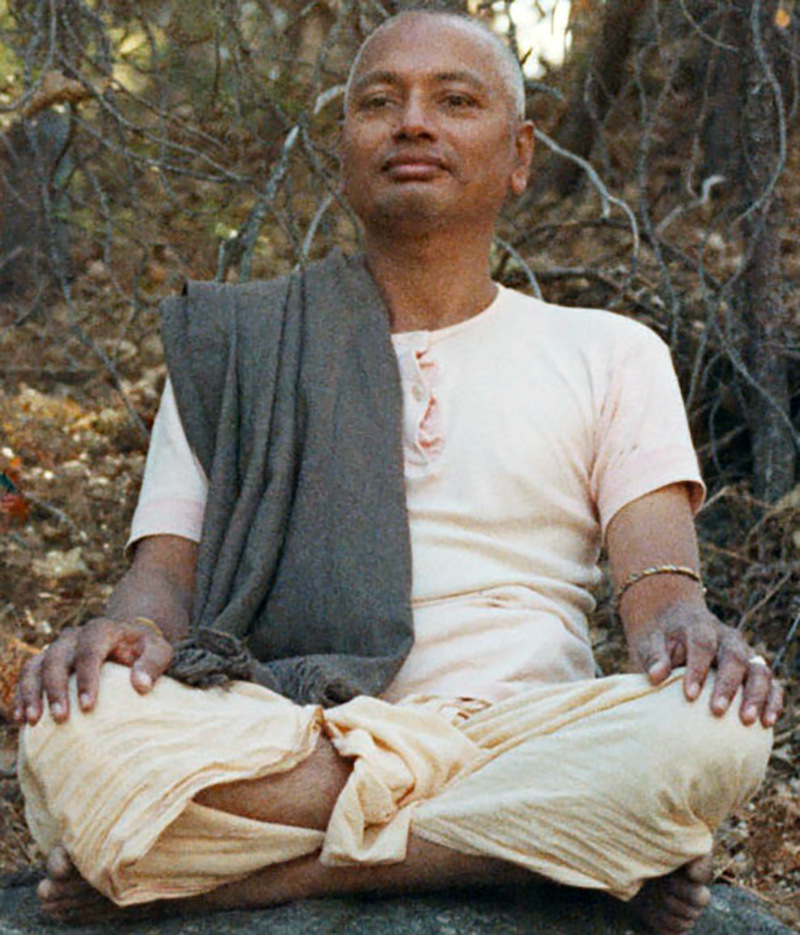 See full screen imageHere at the Sivananda Yoga Centre in Los Angeles with Swami Vishnu (right ..in shadow) and Swami Hrdayananda (centre being garlanded by then co-director, Radha Speer), Venkatesananda (far left), in his usual spot (not attracting attention or blocking the view of photo of Master Sivananda in the altar), sitting with his back up against the closer door. He often sat in that spot, even when he was the only Swami present, giving many inspiring talks and making us laugh continuously so that we could learn not to take ourselves too seriously.
