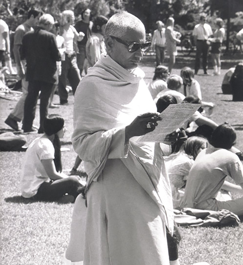 See full screen imageSwami Venkatesananda was asked to attend and speak at the very first Earth Day at The University of California, Davis. Here he is looking through a program of the event before the events of the day began. (Photo by Joan Hyman)
