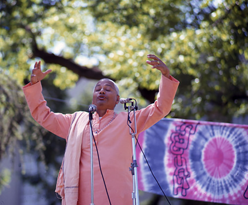 See full screen imageSwami Venkatesananda on the stage, giving a short talk on yoga at the very first Earth Day in 1970 at The University of California, Davis. (Photo by Joan Hyman)