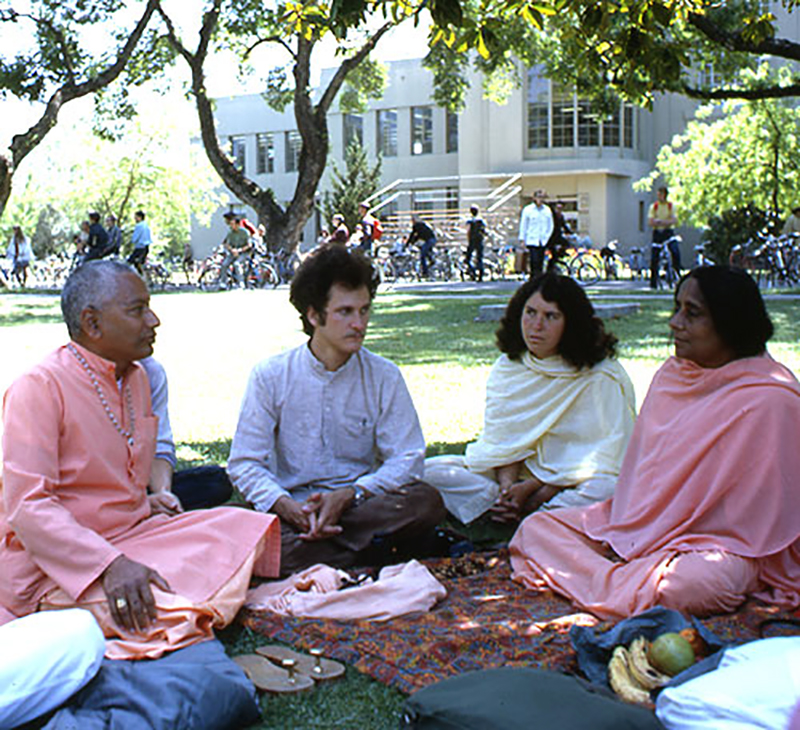 See full screen imageSitting and talking during Earth Day events. From left to right, Swami Venkatesnanda, Ganga White(of White Lotus Foundation) seated to the right of Swami Venkatesananda, unidentified student (white shawl), and Swami Hrdayananda on the far right.