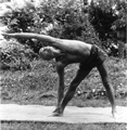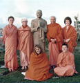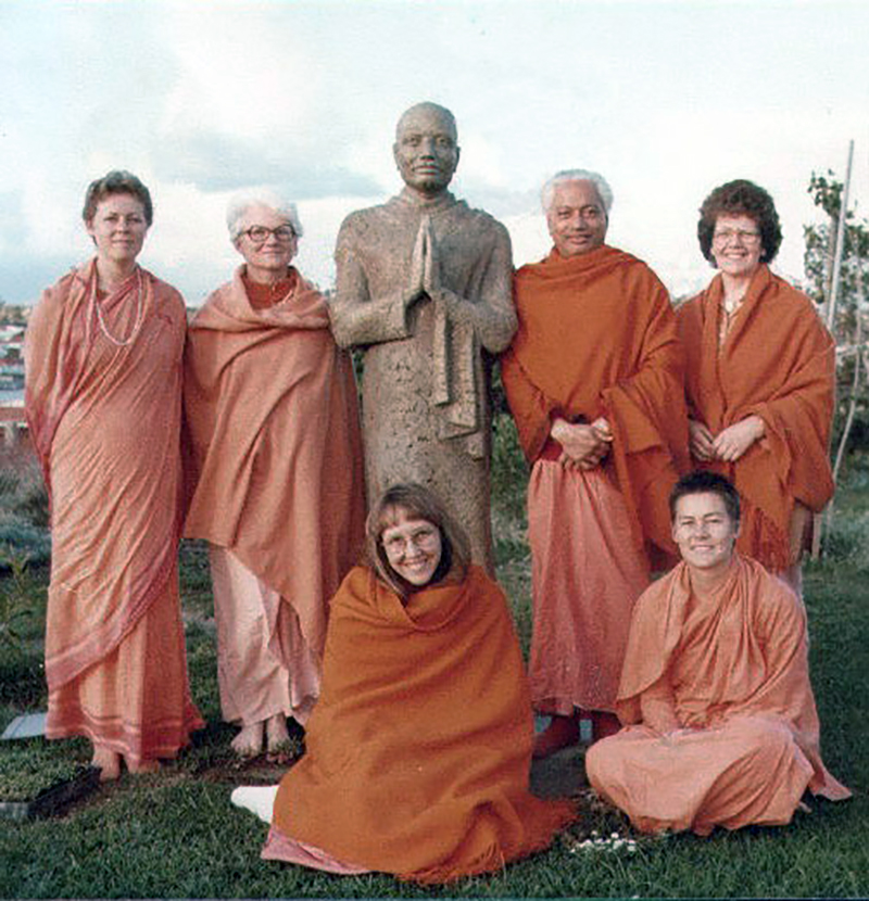 See full screen imageWith statue of Venkatesananda in the garden at the Beacon Hill Centre, standing from left to right: Hamsa, Lakshmiananda, Swami Venkatesananda, Dorothy, and seated from left to right: Sushilananda, and Janaki.
